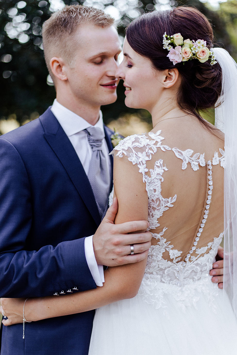 Ein Traum aus Tüllrock und moderner Tattoo-Spitze mit einem langen Schleier und Blumen um Haar.